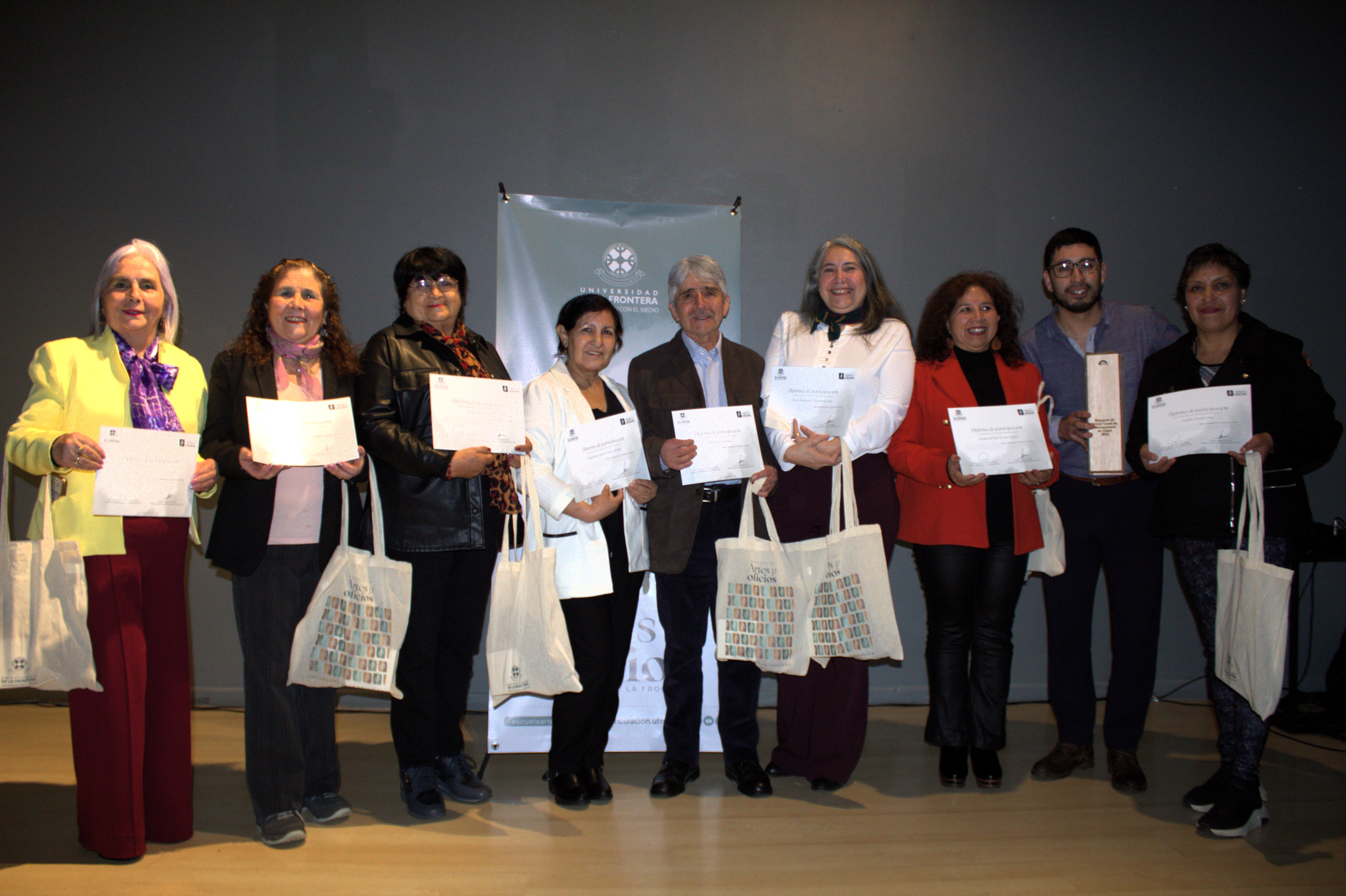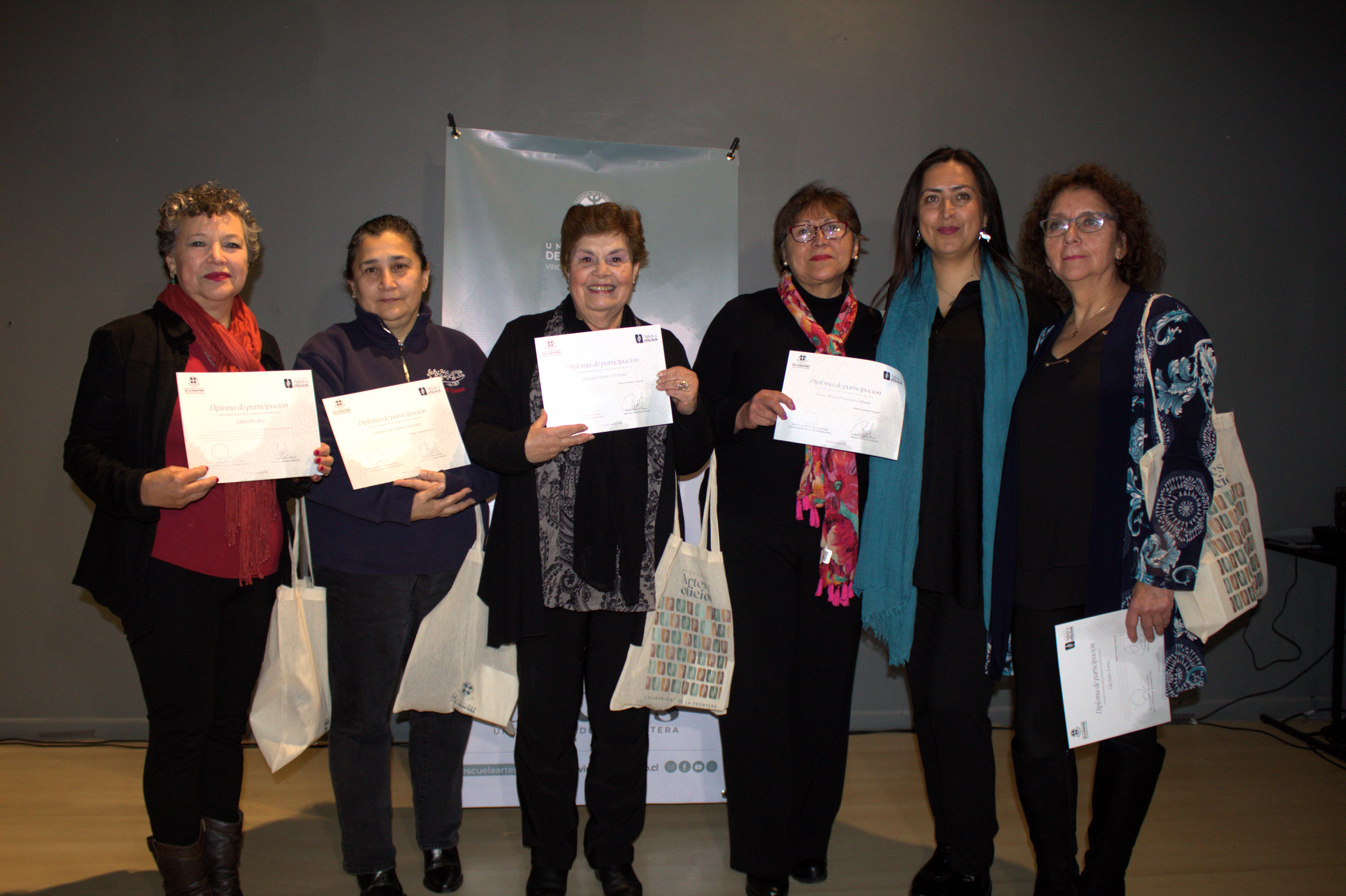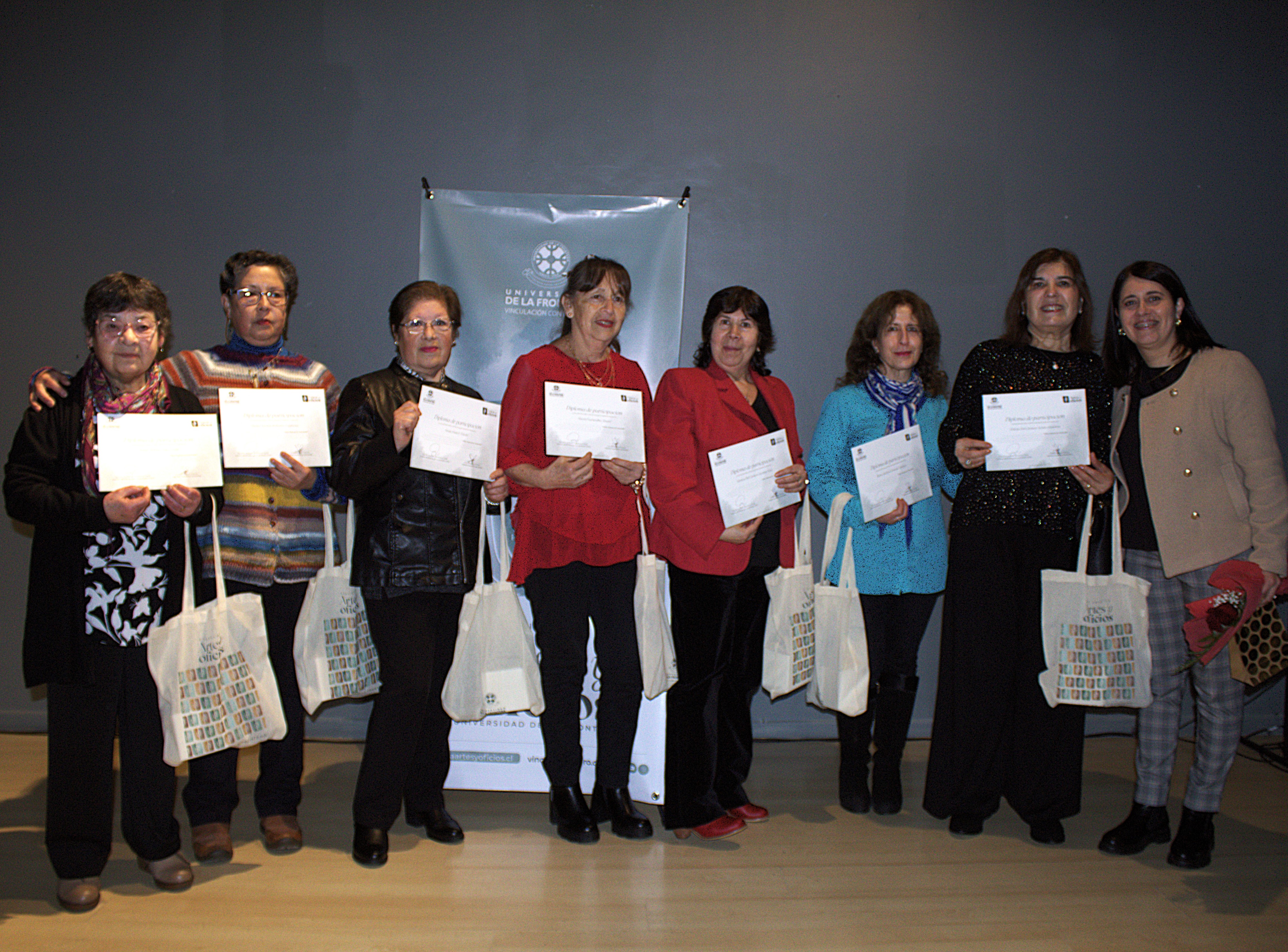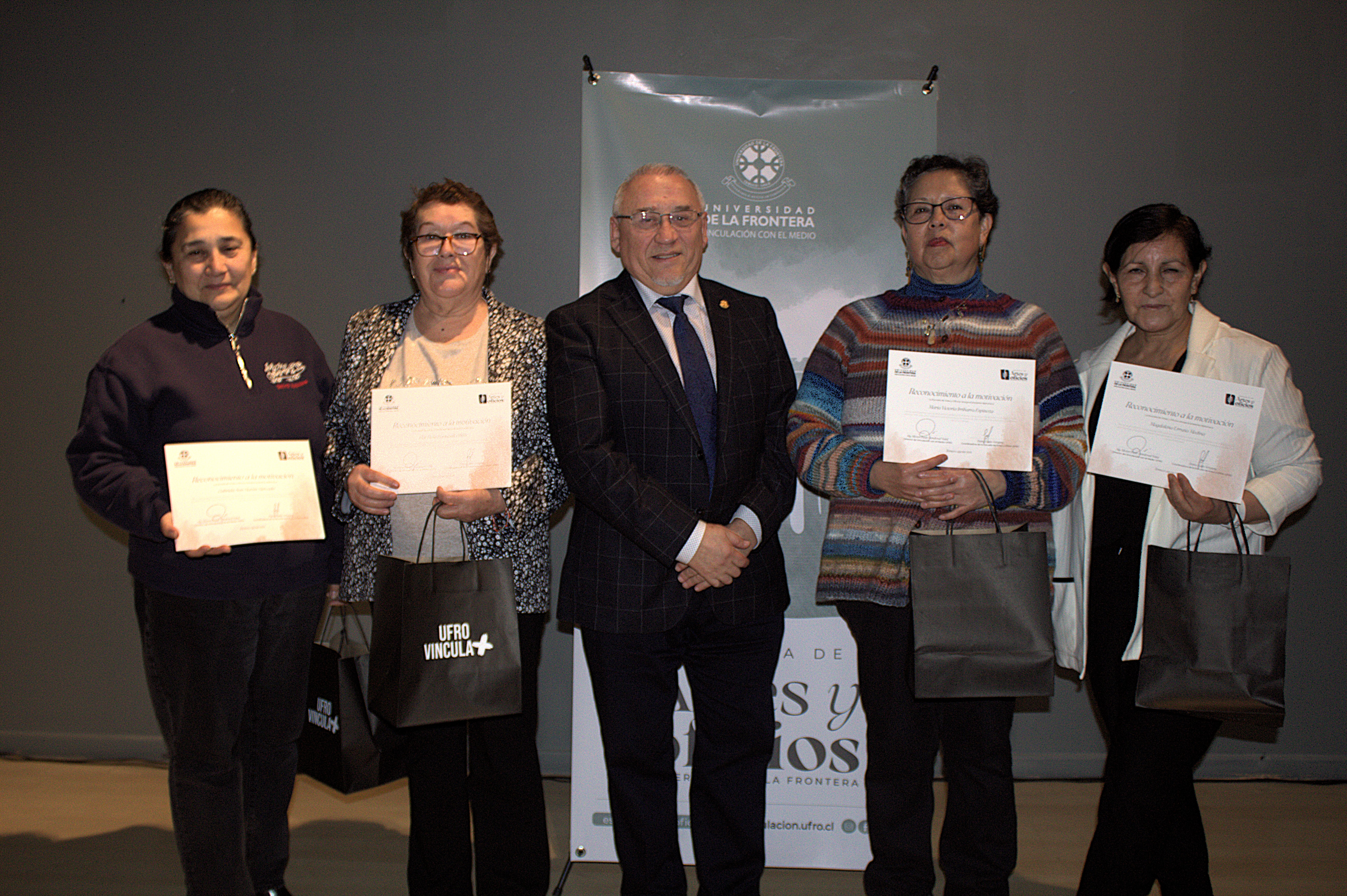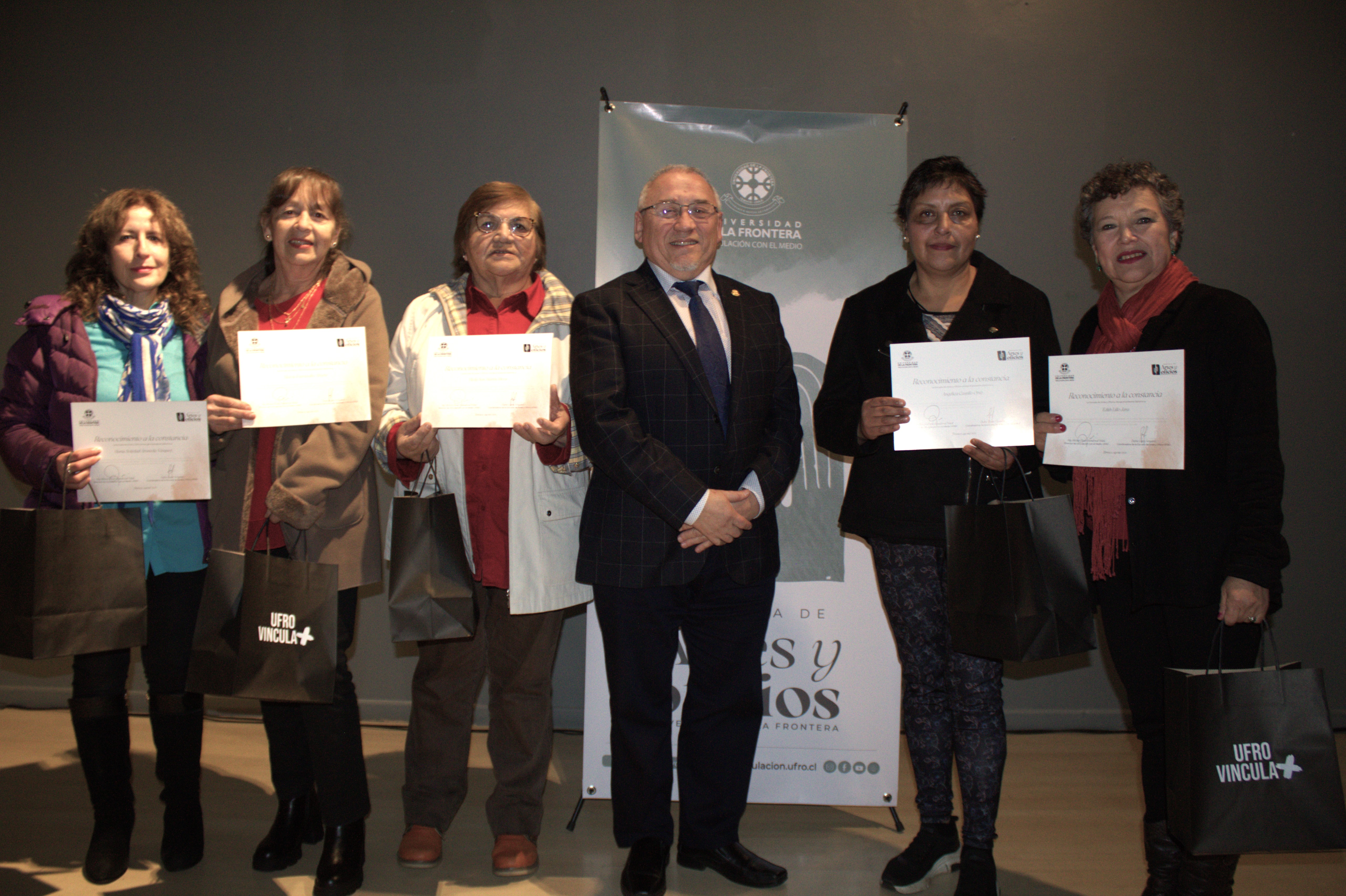 La jornada, realizada en la Sala de Artes de la Dirección de Vinculación con el Medio, reunió a 40 personas mayores de 55 años que participaron en los cursos gratuitos de Marroquinería y Artesanía en cuero, Bisutería textil, Repostería saludable y Cosmética natural. Además de la entrega de diplomas, la comunidad pudo recorrer una muestra con los trabajos realizados y disfrutar de presentaciones musicales a cargo de la estudiante de Derecho UFRO, Josefina Lillo y la violinista Daniela Fernández.